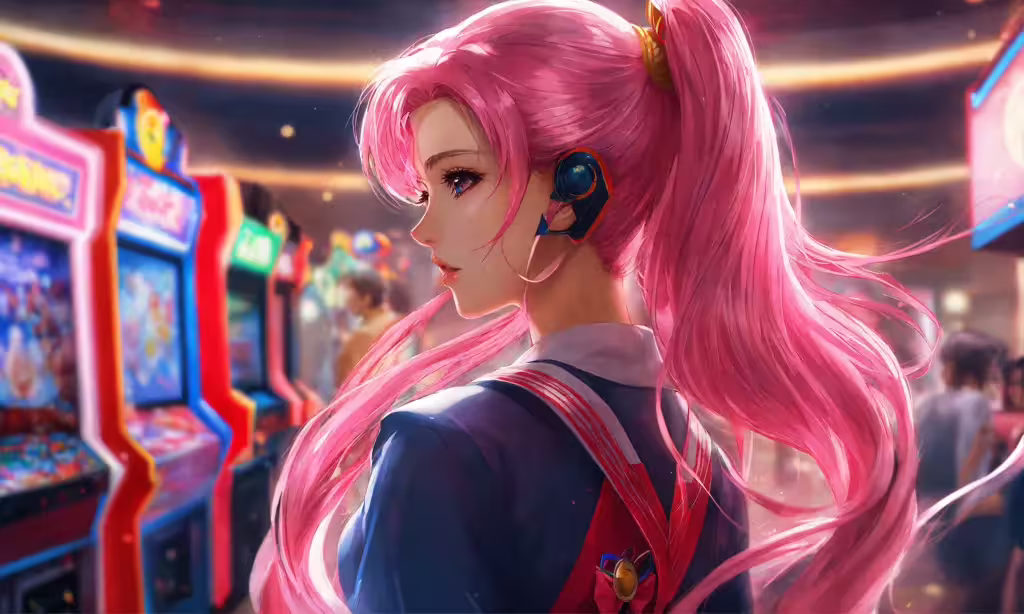 High resolution picture, free to use, an anime style girl with long pink hair in front of a arcade machine