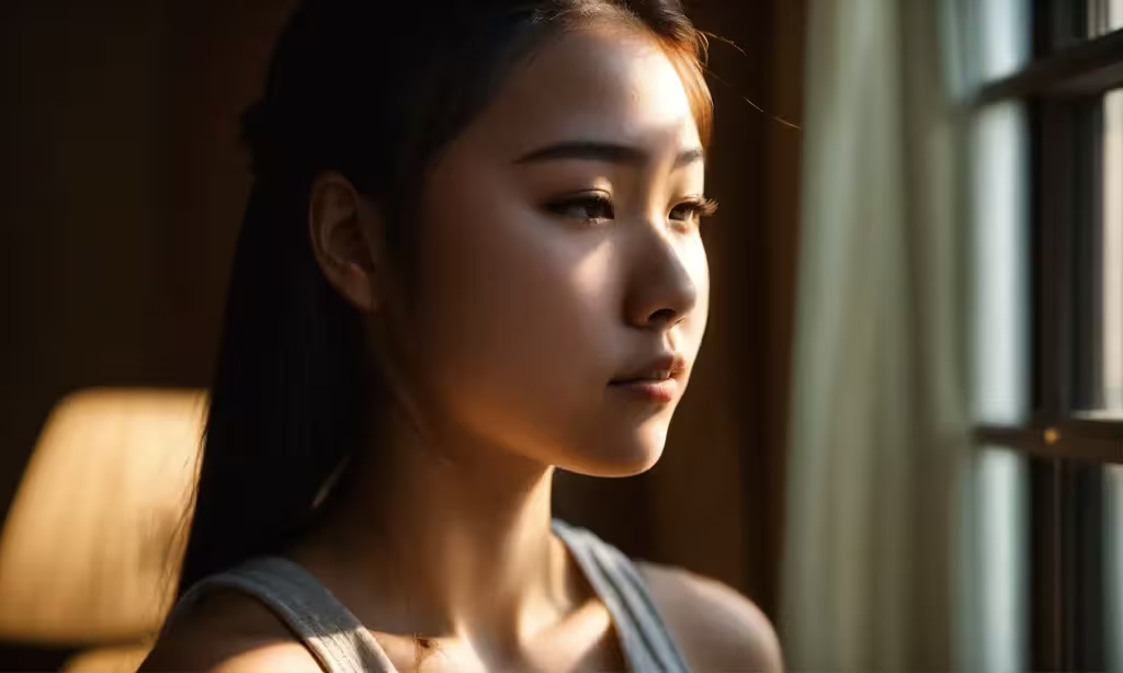 High resolution picture, free to use, an asian woman looking out of a window at the sunshine
