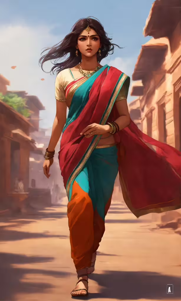 High resolution picture, free to use, the woman walking in the street is wearing a saree